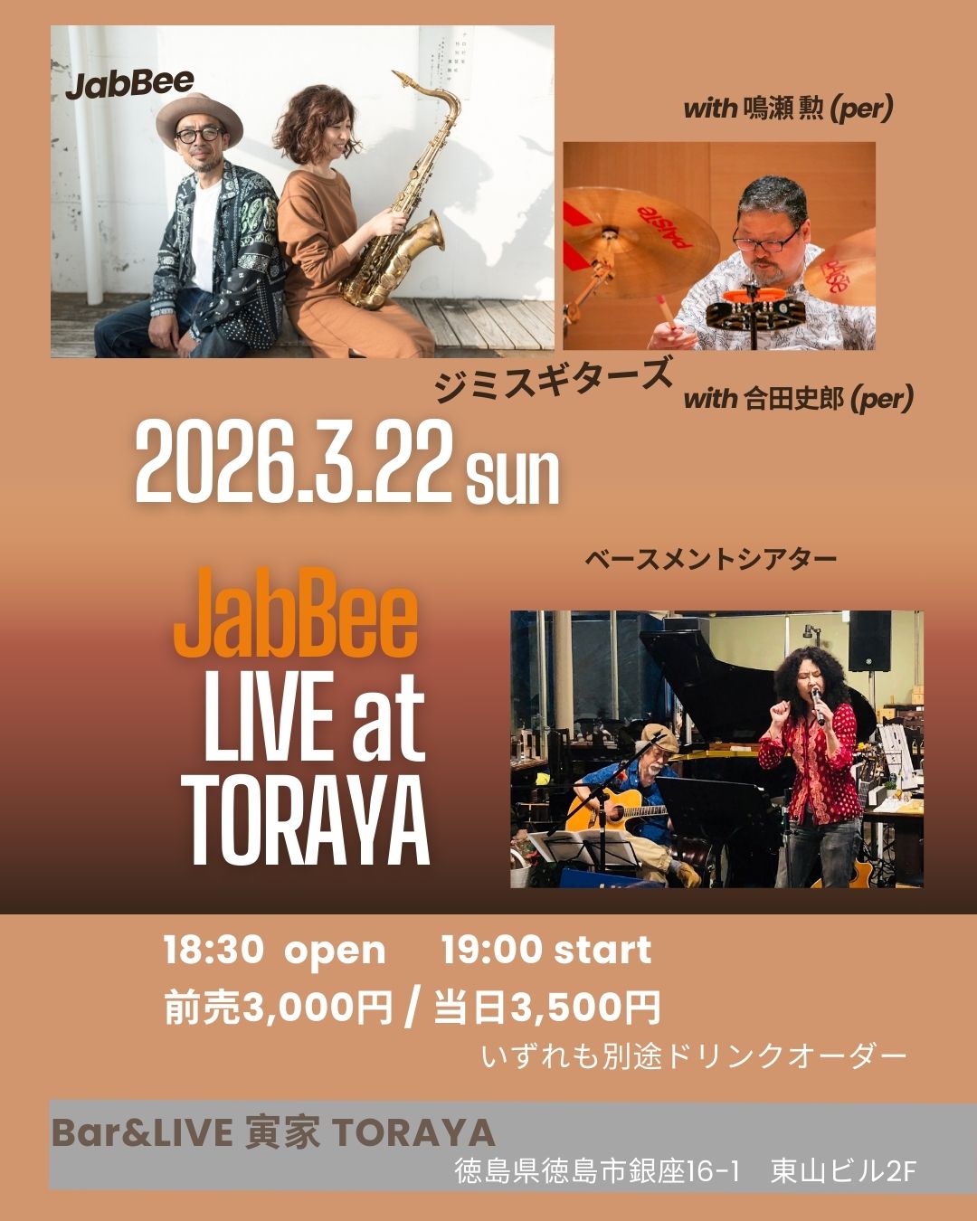 今年も徳島の素敵なお店、寅家 さんへ伺います! JabBee はパーカッションに鳴瀬 勲 さんをお迎えしてお届けします! 共演を予定していた ジミスギターズはルリさんが残念ながら欠席のため ギター加藤さんの別ユニット・ベースメントシアターとの共演となりました。 【日付】2026年3月22日(日) [...]