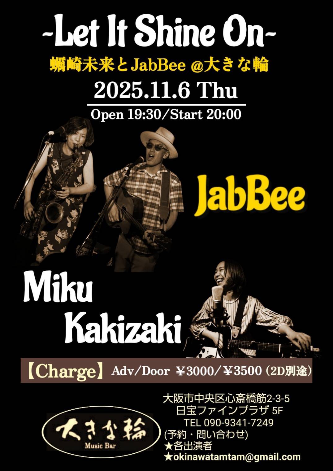深い唄声を持つ、蠣崎未来との関西ツアー! 初日は大阪のディープなお店、大きな輪。 【日付】2025年11月6日(木) 【場所】大きな輪 https://www.facebook.com/pages/大きな輪/190663027648101/ 大阪市中央区心斎橋筋2-3-5 日宝ファインプラザ 5F 【開場】19:30 【開演】20:00 [...]