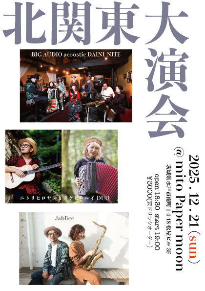 水戸Paper moonへ 栃木出身の素敵なシンガーソングライター、 ニトリヒロヤスを連れて行きます! 素晴らしいアコーディオン奏者、タケヒロルイとのDUOです! そして、 地元の強烈な個性を放つジプシーロックバンド、 B. A.a.D.も出演の豪華な夜! [...]